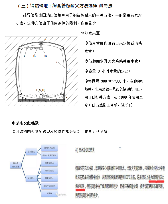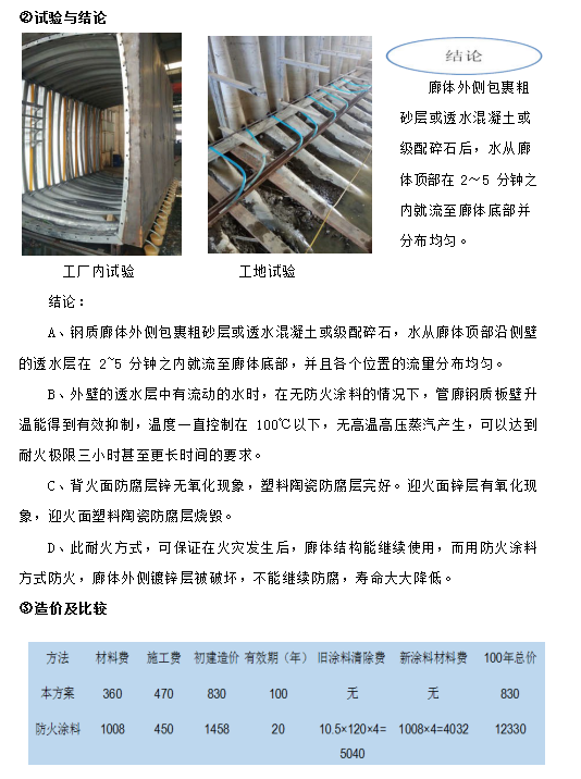 ⑨ 應(yīng)對耐火極限三小時(shí)的方式是涂耐火涂料,但耐火涂料壽命只有 10~20 年, 并且不能長期耐潮,在壽命到期失效后重新涂刷時(shí),由于內(nèi)部管線及設(shè)施的存在, 清除殘余失效涂層的工作量大,涂刷新涂層更繁雜,費(fèi)用較初次施工時(shí)大大增加, 并且在管廊整個壽命周期內(nèi)要多次更換防火涂層;更為重要的是,耐火涂料只能阻止火災(zāi)時(shí)鋼結(jié)構(gòu)的溫度不高于 550℃,但對于鋼結(jié)構(gòu)地下管廊來說情況特殊,在火災(zāi)發(fā)生半小時(shí)左右,耐火涂料覆蓋的鋼結(jié)構(gòu)體溫度就超過 150℃,廊體外部土壤中的水份形成高溫高壓蒸汽,其產(chǎn)生的次生災(zāi)害有可能嚴(yán)重于火災(zāi)本身。